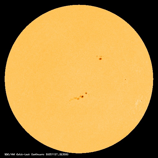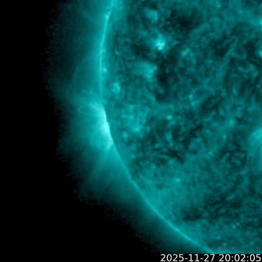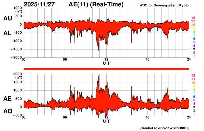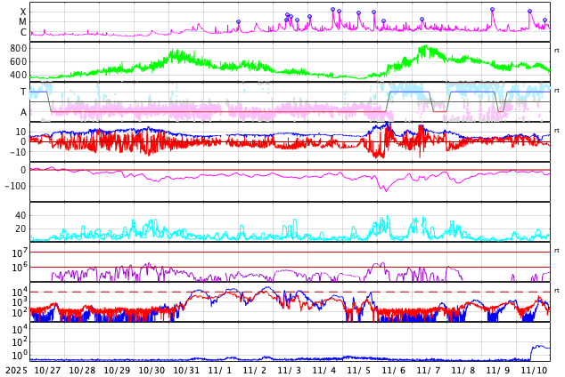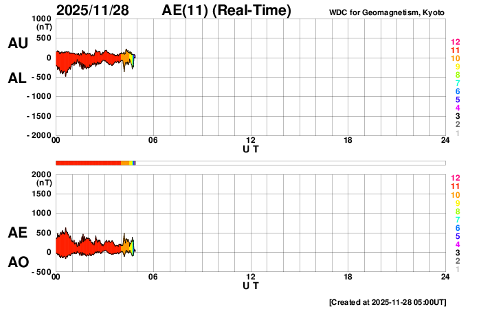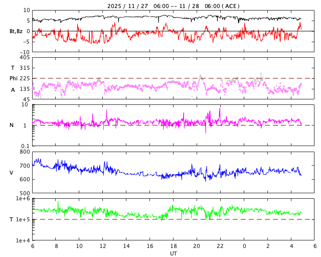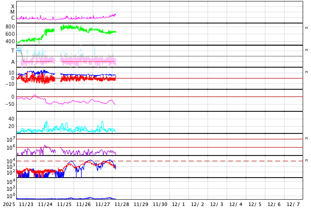 2025/11/28 14:05 更新 太陽風は650km/秒と高速の状態が続き、磁気圏活動も続いています。 担当 篠原 太陽風の速度は、700km/秒から650km/秒へ少し下がっていますが、 高速の状態は続いています。 磁場強度は、5nTから6〜7nTへ、 小さいですが少し上がっています。 太陽風磁場の南北成分は、南寄りで変化しています。 速度が高まっていることと重なって、 磁気圏の活動は強まった状態が続いています。 AE指数は、1000〜2000nTと大きい変化が度々発生しています。 引き続き注目して下さい。 27日周期の図を見ると、 太陽風速度の高まりは4日になろうとしています。 GOES衛星SUVI 195を見ると、 コロナホールは南西の端(左下)に近付いています。 太陽風速度の高まりは、次第に下がっていきそうです。 一方、東側(左側)には、 次のコロナホールの広がりが見えています。 前周期にも見られた領域です。 現在はどの様な広がりになっているか、 この後の見え方に注目して下さい。 太陽は、目立ったフレアは発生していませんが、 X線グラフは、最後のところでゆっくりと高まっています。 これは、南東の端(左下)の向こう側に活動的な領域があって、 その明るさが見え始めているからです。 GOES衛星SUVI 131の動画を見ると、 フレアの輝きが頻繁に発生しています。 この後、どの様な領域が現れるでしょうか。