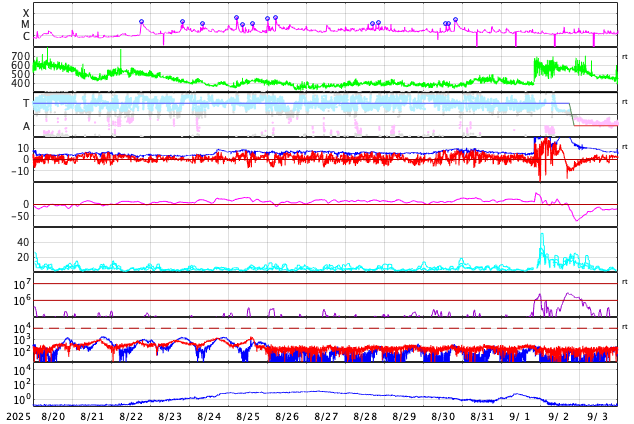 GOES衛星の太陽X線強度。赤・橙 = 0.1〜0.8 nm、青・紫 = 0.05〜0.4 nm (c) データ:NOAA/SWPC、作図:宇宙天気ニュース ![]() | ||||||||||||||||||||||||||||||||||||||||||||||||||||||||||||||||||||||||||||||||||||||||||||||||||||||||||||||||||||||||||||||||||||||||||||||||||||||||||||||||||||||||||||||||||||||||||||||||||||||||||||||||||||||||||||||||||||||||||||||||||||||||||||||||||