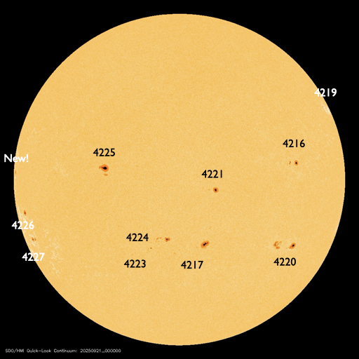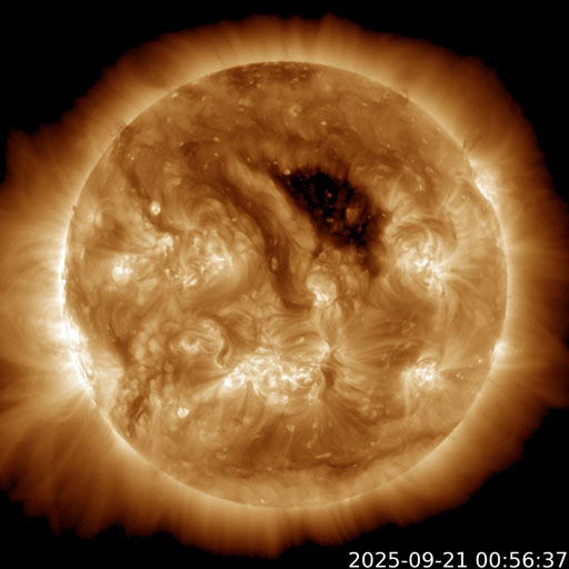 2025/ 9/21 10:47 更新 太陽風は更に低速になっています。磁気圏も穏やかです。 担当 篠原 太陽風の速度は370km/秒から330km/秒へ下がり、 更に低速になっています。 磁場強度は、3〜5nTで小さく変化しています。 平均的な状態です。 磁場の南北成分は、やや北寄りで推移しています。 速度が下がっていることもあり磁気圏は穏やかで、 AE指数はほとんど変化のない状態です。 GOES衛星SUVI 195では、 コロナホールは北西側(右上)に進んでいます。 明日くらいから、 この領域の影響で太陽風の速度が高まりそうです。 27日周期の図を見ると、 前周期はコロナホールが小さかったためか、 速度の高まりは来ていません。 今回はどの様になるでしょうか。 太陽は穏やかな状態です。 南西(右下)の4220黒点群でC3.4の小規模フレアが発生した程度です。 ![]() GOES衛星SUVI 195カメラによる太陽コロナの様子 (c) GOES衛星SUVI 195 (NOAA) ![]() SDO衛星による太陽の可視光写真。SOHO衛星のWebページより取得しました。 (c) SDO (NASA) ![]() ACEが観測した太陽風の磁場(黒線は全体の強度、赤線は南北成分) 磁場の向き、プラズマの密度、速度、温度 (c) データ:NOAA/SWPC、作図:宇宙天気ニュース ![]() AE指数(速報値) 下段のAEグラフの値が高くなると、オーロラ活動が活発化しています。 (c) 京都大学WDC ![]() ![]() 27日の太陽周期に合わせた図 太陽が同じ面を地球に向けていた27日前の変化から、今後を予想することができます。 (c) 作図:宇宙天気ニュース