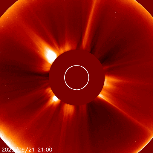2025/ 9/23 10:02 更新 高速太陽風が到来して、速度は520km/秒に高まっています。 担当 篠原 太陽風は、330km/秒と低速の状態からゆっくりと高まり、 23日3時(世界時22日18時)頃に520km/秒と高速の風になり、 以降、この状態が続いています。 コロナホールの影響が始まった様です。 太陽風の磁場強度は、10nTから18nTへ強まり、 その後下がって、現在は10nTに戻っています。 強まった状態は続いています。 太陽風磁場の南北成分は、北寄りになっています。 このため、磁気圏の活動はあまり強まっておらず、 AE指数は、速度が高まった後に時々500nTの変化が発生する程度です。 GOES衛星SUVI 195では、 コロナホールは北西側(右上)に更に進んでいます。 横の広がりがあまり大きくないので、 高速太陽風は比較的短い期間で終わりそうです。 どのくらい続くか注目して下さい。 昨日のニュースで紹介した、 太陽の右下へ広がるCME(コロナ質量放出)の続きの動画を掲載します。 C2(赤色)に続いて、C3(青色)でもきれいに広がっています。 太陽の可視光写真では、黒点が多く見えています。 フレアは、南東の端(左下)の領域でC4.2の小規模フレア、 その隣の4227群でC3.8の小規模フレアが発生しています。