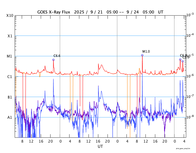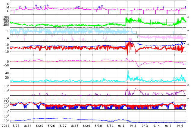GOES衛星の太陽X線強度。赤・橙 = 0.1〜0.8 nm、青・紫 = 0.05〜0.4 nm (c) データ:NOAA/SWPC、作図:宇宙天気ニュース ![]() | ||||||||||||||||||||||||||||||||||||||||||||||||||||||||||||||||||||||||||||||||||||||||||||||||||||||||||||||||||||||||||||||||||||||||||||||||||||||||||||||||||||||||||||||||||||||||||||||||||||||||||||||||||||||||||||||||||||||||||||||||||||||||||||||||||||||||||||