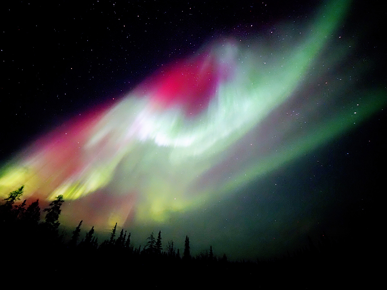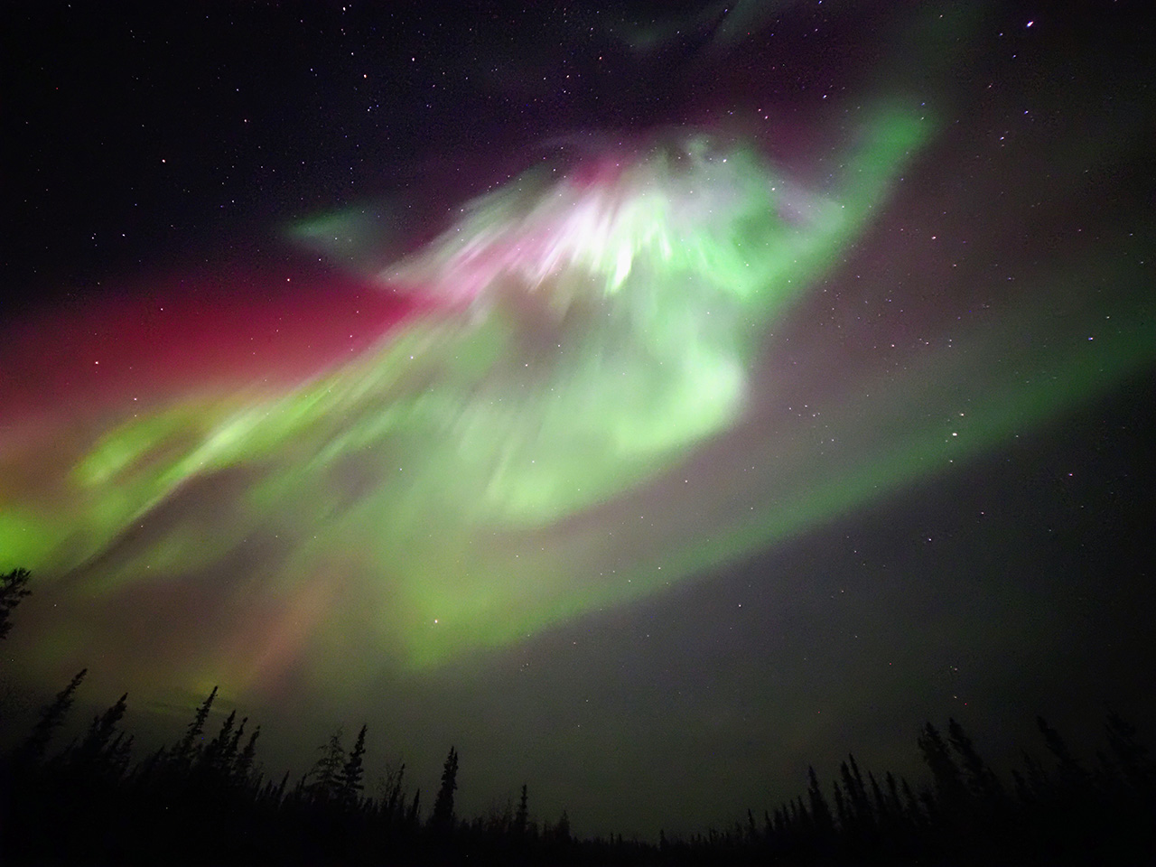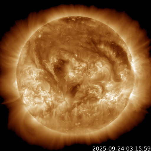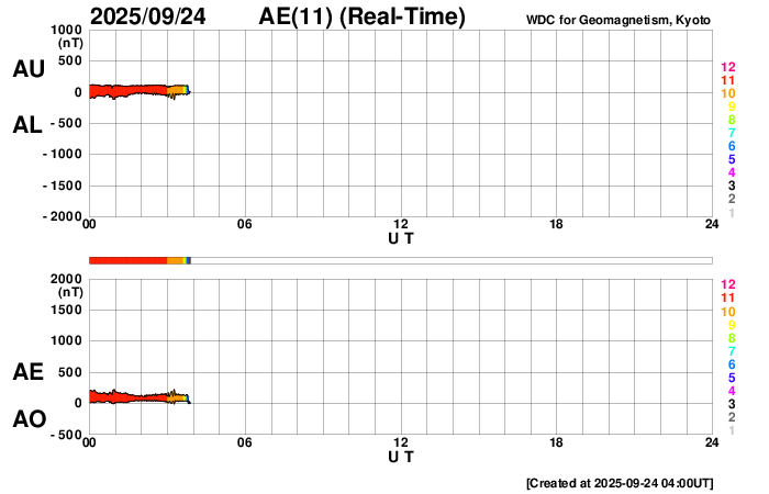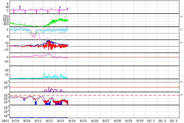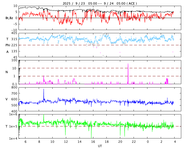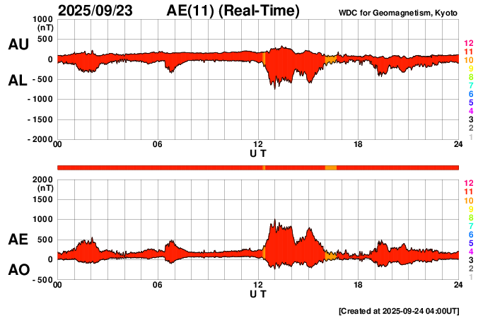 2025/ 9/24 13:04 更新 太陽風は高速の状態が続いています。イエローナイフの21日夜のオーロラをどうぞ。 担当 篠原 景山植光さんより、21日夜にカナダ・イエローナイフで撮影された オーロラの写真をいただきました。 現在の高速太陽風が始まる直前の頃で、 太陽風の速度は330km/秒と低速でしたが、 磁場強度は10nTに強まっていました。 この頃に発生した小規模の活動で、 AE指数では目立った変化は発生していませんでした。 イエローナイフでは見事なオーロラが発生していた様です。 赤と緑の色の組み合わせがとてもきれいです。 2枚目の写真では、右側に夏の大三角や夏の天の川が見えています。 実際の空での広がりが想像できます。 続きの写真を明日、明後日に掲載する予定です。 現在の太陽風は、550km/秒と高速の状態が続いています。 磁場強度は、10nTからゆっくり下がって、 5nTと平均的な値に戻っています。 コロナホールの影響が続いている様です。 磁場の南北成分は、比較的北寄りですが、 南向きにも変化していて、磁気圏の活動はある程度強まっています。 AE指数は、500〜800nTの中規模の変化が度々発生しています。 GOES衛星SUVI 195では、 コロナホールは北西の端(右上)に近付いています。 この後、太陽風の速度は低下に向かいそうです。 太陽は、南西(右下)の4217黒点群でM1.0の中規模フレア、 隣の4224群でC6.8の小規模フレア、 南東(左下)の4226群でC5.5の小規模フレアが発生しています。 特に活動的という印象はありません。
