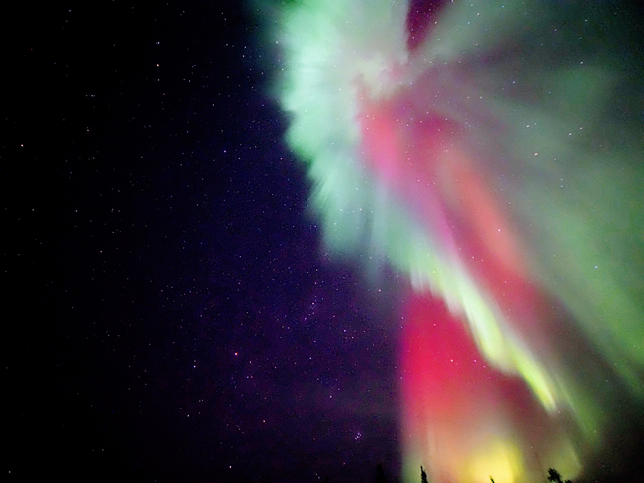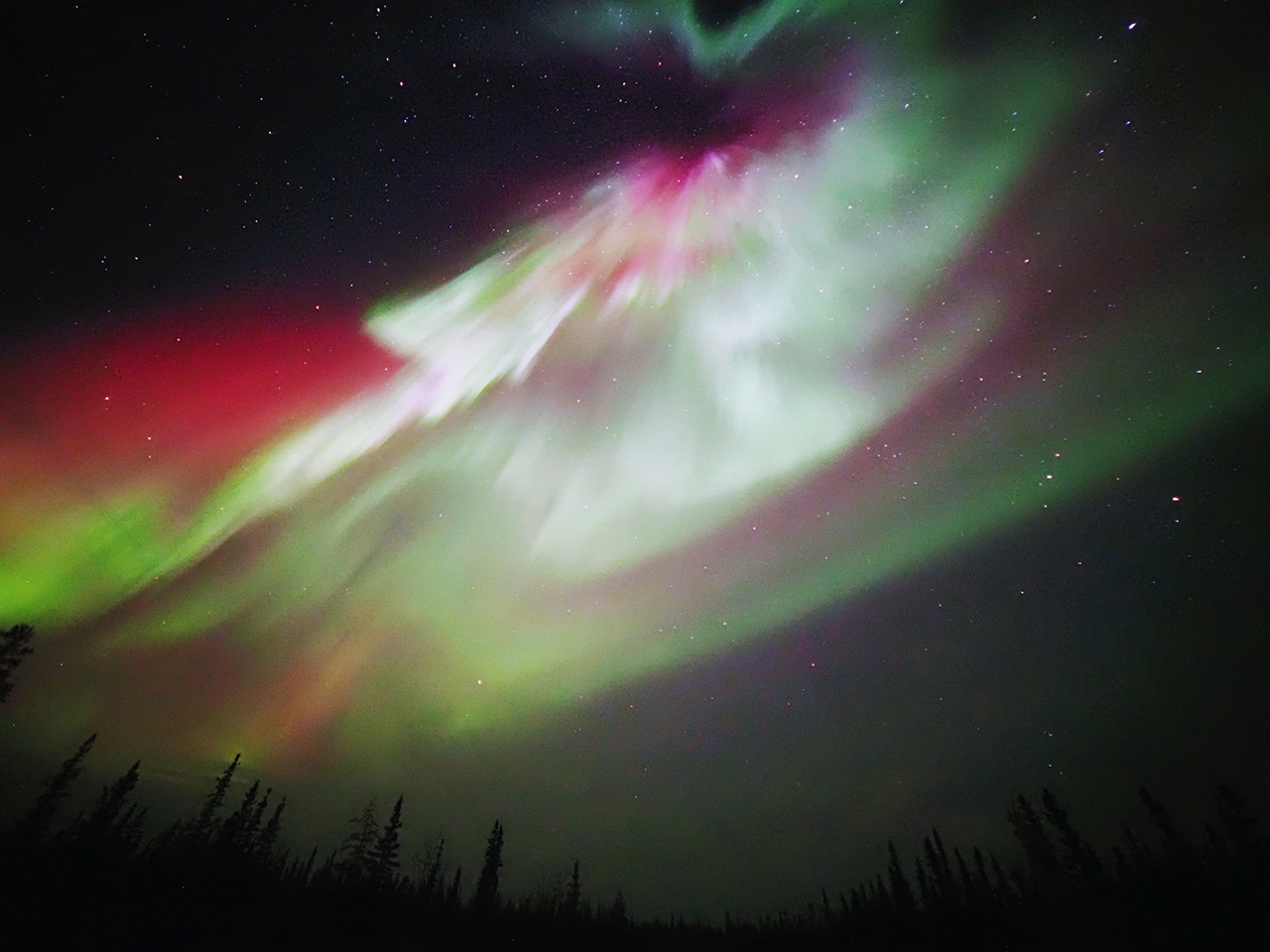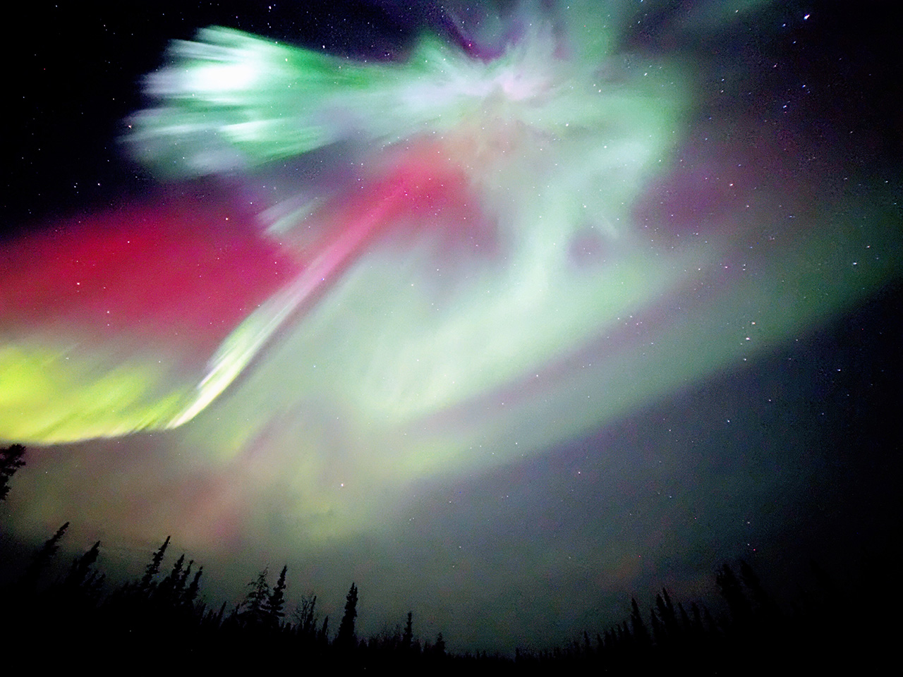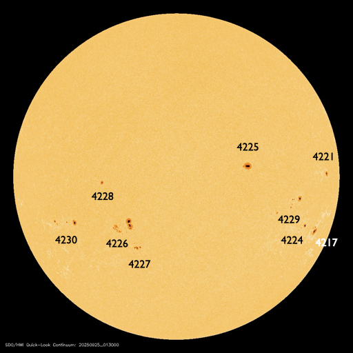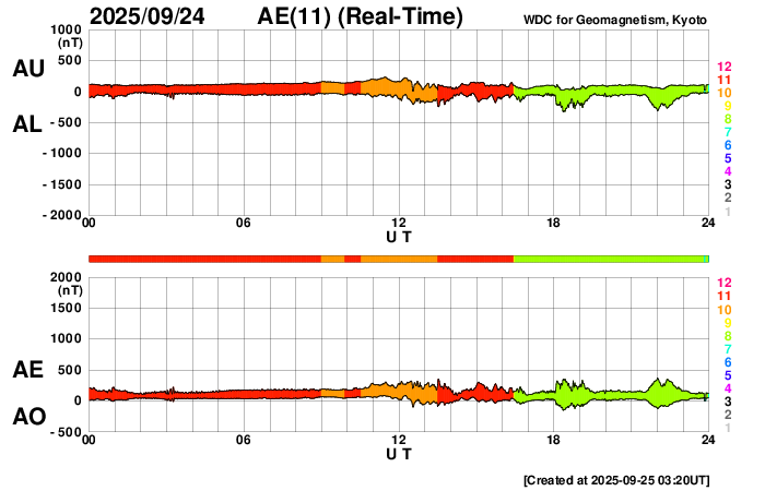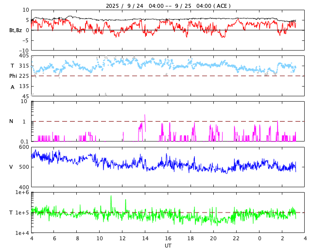 2025/ 9/25 12:27 更新 太陽風は高速ですが、終わりに向かいそうです。イエローナイフの21日夜のオーロラをどうぞ。 担当 篠原 景山植光さんよりお送りいただいた、 21日夜のカナダ・イエローナイフのオーロラ写真の続きです。 昨日の3、4枚目の続きの撮影で、 今日の4枚は、2分ほどの短い間の変化です。 真上から降り注ぐようにオーロラの光が輝いています。 赤と緑、一番下にはピンク色も見えています。 太陽風の状況は、昨日紹介した様に速度は300km/秒台と低速で、 AE指数もほとんど変化が見えていない状態でした。 その中でもイエローナイフの上空でオーロラの活動が起きていた様です。 1〜3枚目では、右端の上側にこと座、中ほどにわし座が見えています。 4枚目では、真ん中の下側にペルセウス座とプレアデス星団が見えています。 とてもきれいな写真を、ありがとうございます。 太陽風は、昨日のニュースの後、速度が500km/秒に下がり、 現在までこの速さが続いています。 高速の状態は続いていますが、 高速太陽風はこの後終わりに向かいそうです。 磁場強度は、5nTで安定しています。 磁場の南北成分は北寄りになっていて、 磁気圏は比較的穏やかです。 AE指数は小規模の変化が見られる程度です。 GOES衛星SUVI 195では、 太陽の中心部にコロナホールは見えていません。 現在の高速風が終わると、 太陽風はしばらく穏やかになりそうです。 太陽は、南西(右下)の4224黒点群で、 昨夕、24日18時半(世界時24日9時半)に、M1.0、 今朝、25日4時(世界時24日19時)に、M1.6と、 中規模フレアが2回発生しています。 また、中心部南東(左下)の4226群で、 C3.5、C5.3、C4.6と小規模フレアが続いています。