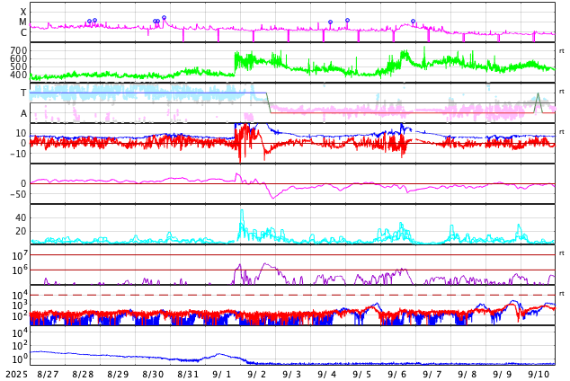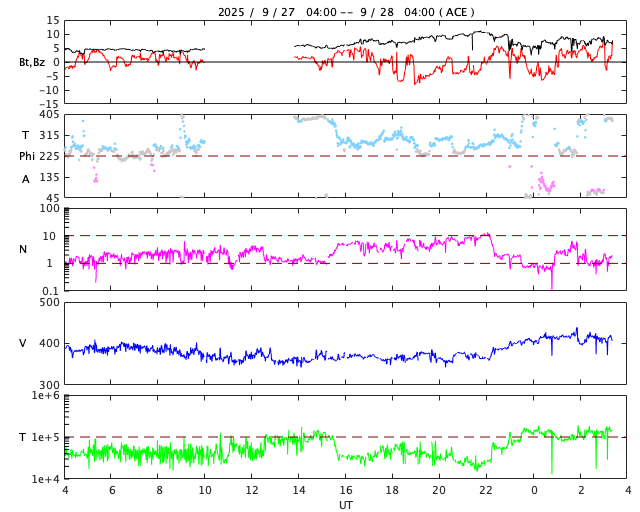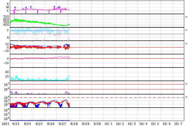 2025/ 9/27 13:34 太陽風はやや低速になっています。イエローナイフの23日未明のオーロラをどうぞ。