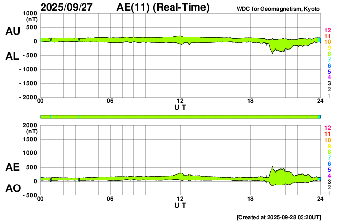 下段のAEグラフの値が高くなると、オーロラ活動が活発化しています。