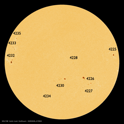 太陽は、北東の端(左上)に4232、4233、4235と3つの黒点群が現れています。