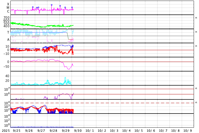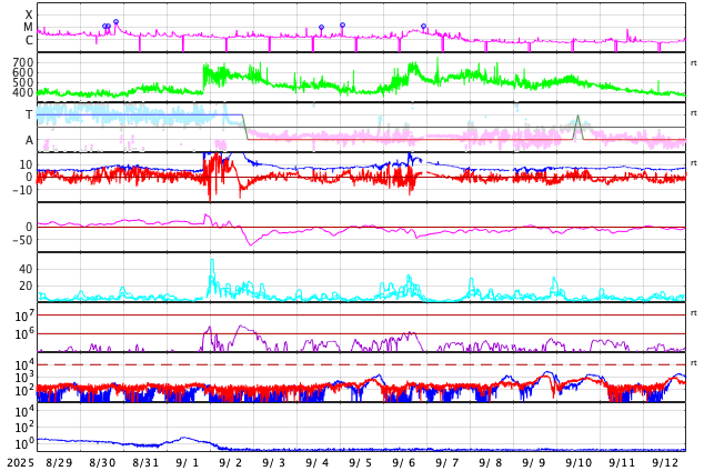 GOES衛星の太陽X線強度。赤・橙 = 0.1〜0.8 nm、青・紫 = 0.05〜0.4 nm (c) データ:NOAA/SWPC、作図:宇宙天気ニュース ![]() | |||||||||||||||||||||||||||||||||||||||||||||||||||||||||||||||||||||||||||||||||||||||||||||||||||||||||||||||||||||||||||||||||||||||||||||||||||||||||||||||||||||||||||||||||||||||||||||||||||||||||||||||||||||||||||||||||||||||||||||||||||||||||||||||||||||||||||||||||||||||||||||||||||||||||||||||||||||||||||||||||||||||||||||||||||||||||