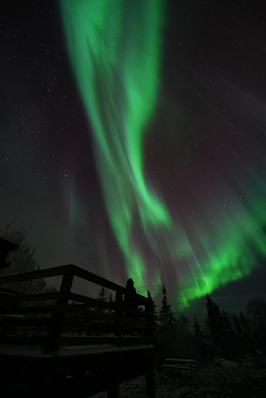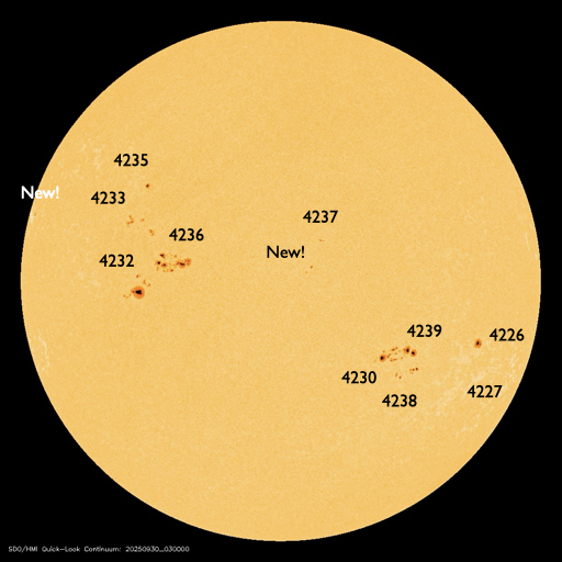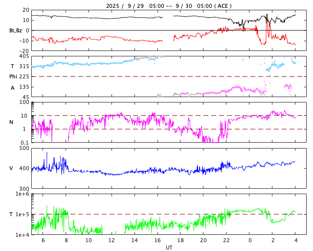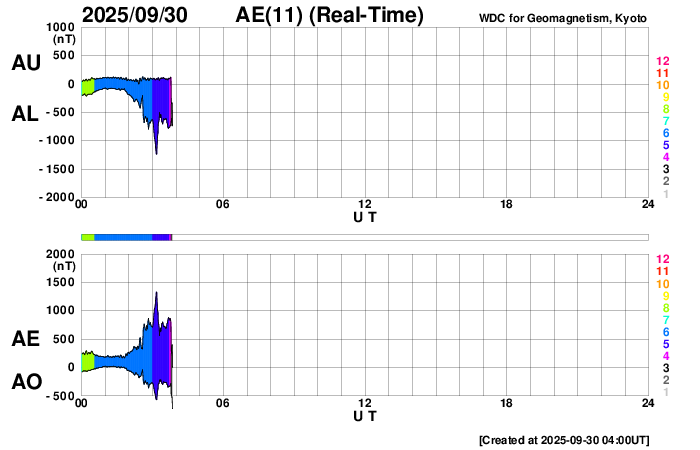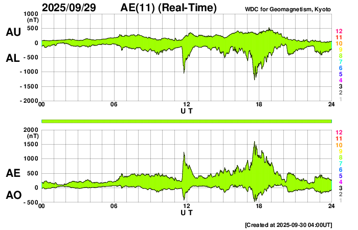 2025/ 9/30 13:12 更新 太陽風磁場が南向きに強まり、磁気圏の活動が激しくなっています。アラスカのオーロラをどうぞ。 担当 篠原 昨日のニュースの後も、 太陽風の磁場強度は12〜14nTと強まった状態が続きました。 磁場の南北成分は、29日10時(世界時29日1時)頃から南向きに強まる様になり、 -5〜 -10nTの状態が、今朝、30日5時(世界時29日20時)頃まで続きました。 太陽風の速度は400km/秒と平均的な状態でしたが、 磁気圏の活動は激しくなり、 AE指数は、1200〜1500nTに達する大きい変化が2回発生し、 その前後の時間帯も500nT程度で推移しています。 Dst指数も、-80nTと中規模の変化になっています。 この時に強まったオーロラの写真を、 アラスカ・フェアバンクスの今野さんよりいただきました。 背景の星空やイエローナイフのライブ動画を参考にすると、 現地28日23時(世界時29日7時)前後ではないかと思います。 今年の秋のアラスカはかなり湿度があって、 天気の悪い日が続いていたそうです。 この日も多少ガスがかかっていたものの、 久々の良いオーロラだったとのことです。 上空に赤いオーロラが高く伸びていて、迫力を感じます。 2枚目の写真では、中央に北斗七星が見えています。 この向きの時に地面から離れた所に見えるのは、高緯度ならではです。 興味深い速報をどうもありがとうございます。 今回の太陽風磁場の強まりの原因は、 4枚目に掲載している24日に発生したCME(コロナ質量放出)かもしれません。 この動画は、太陽を地球よりも右斜めから観測している STEREO Ahead衛星のCOR2によるものです。 太陽の左に向かってCMEがゆっくりと広がっています。 このCMEは、地球から見るとより正対する形になり、 SOHO衛星LASCO C2では、かなり淡い状態で見えています。 ただ、GOES衛星SUVIの画像では、 対応する変化が太陽のコロナでは見つけられず、 どこからどの様に広がったのか分かりませんでした。 この噴出が原因だとすると、4日ほどかけて地球に来たことになり、 タイミングとしては妥当なところだと思います。 現在の太陽風は、速度は430km/秒に少し上がっていますが、 平均的な状態です。 磁場強度は、一旦5nTに下がりましたが、 再び10nTに強まっています。 南北成分は南向きに強まっていて、-14nTに達しています。 磁気圏の活動も強まっていて、 AE指数のグラフの最後で、1300nTの大きい変化が発生しています。 引き続き太陽風や磁気圏活動の変化に注目して下さい。 GOES衛星SUVI 195では、 コロナホールが太陽の中心線に達しています。 3日後くらいから影響が始まりそうです。 太陽は、昨日のニュースを書いていた頃、 29日10時半(世界時29日1時半)に、 北東(左上)の4232黒点群でM3.6の中規模フレアが発生しました。 その後も、29日20〜21時(世界時29日11〜12時)にかけて、 4232群、4236群、4233群で、 M1.0、M1.1、M1.0と中規模フレアが発生し、 今朝、30日10時(世界時30日1時)にも、 4232群でM1.2の中規模フレアが発生しています。 可視光写真では、北東の4236群や、 南西(右下)の4230群周辺で黒点が増えています。 この後もフレアの発生に注目して下さい。