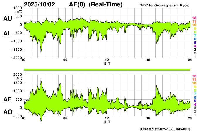 2025/10/ 3 13:56 更新 750km/秒の高速太陽風が続いています。磁気圏活動も活発です。 担当 篠原 太陽風の速度は、750km/秒前後で推移しています。 かなり高まった状態が続いています。 磁場強度は6nTと、昨日からは少し下がっていますが、 平均的な値で安定しています。 磁場の南北成分は、-3nT程度の南寄りの傾向が続いています。 磁気圏の活動は活発に続いていて、 AE指数は、1000〜1500nTの大きい変化が頻繁に発生しています。 GOES衛星SUVI 195では、 南半球のコロナホールは、東西に長く伸びています。 27日周期の図を見ると、 前周期の太陽風は、今日に相当する9月6日から速度が高まり、 9月10日にかけて高速風が続いています。 コロナホールの広がりが変化していることもあり、 今回は、この後どの様に推移するでしょうか。 注目して下さい。 太陽は、昨日の昼のM1.2中規模フレア以降変化が少なくなっていて、 C3程度の小規模フレアが発生した程度です。 可視光写真では、 太陽の中心部に4236、4232黒点群が見えていますが、 活動は落ち着いている様です。