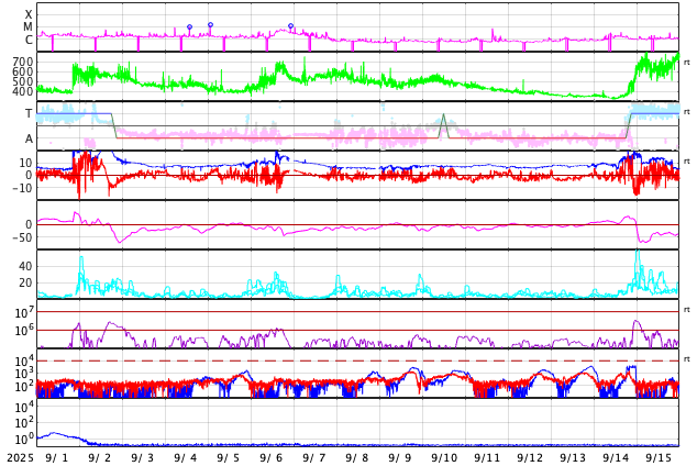 2025/10/ 1 12:31 太陽風の速度が700km/秒に高まっています。磁気圏の活動も活発です。