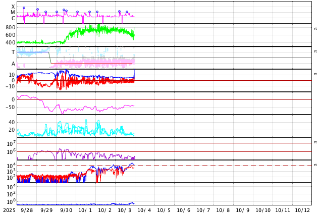 2025/10/ 2 11:57 太陽風は700km/秒の高速の風が続いています。磁気圏も活動的です。