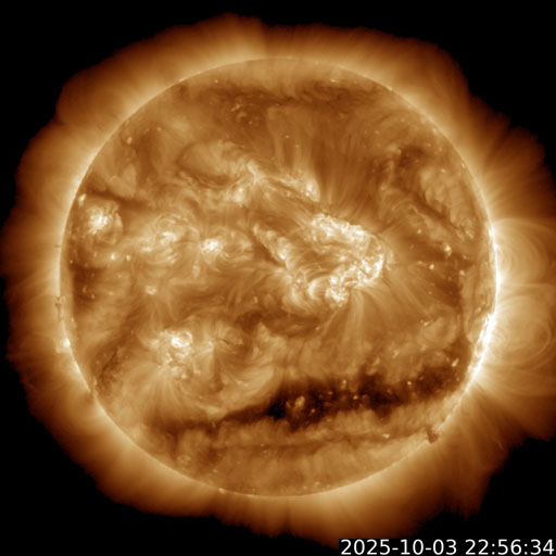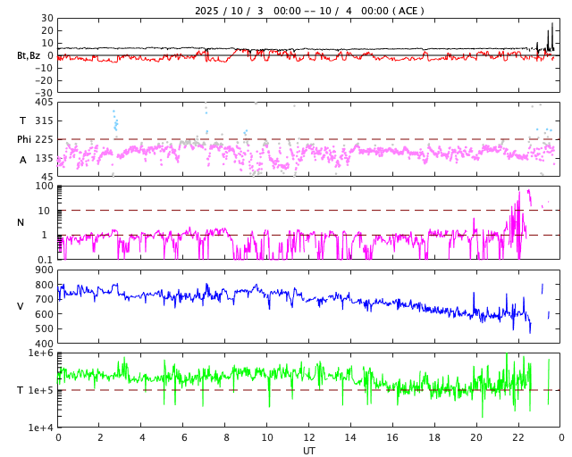 2025/10/ 3 13:56 750km/秒の高速太陽風が続いています。磁気圏活動も活発です。