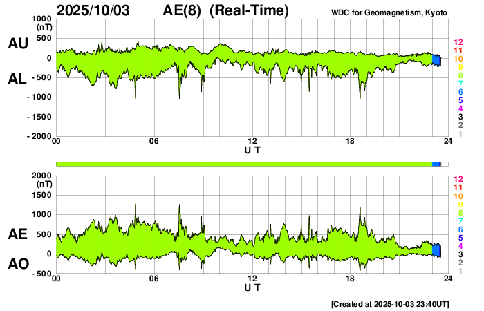 下段のAEグラフの値が高くなると、オーロラ活動が活発化しています。