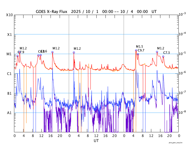 GOES衛星の太陽X線強度。赤・橙 = 0.1〜0.8 nm、青・紫 = 0.05〜0.4 nm