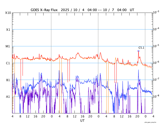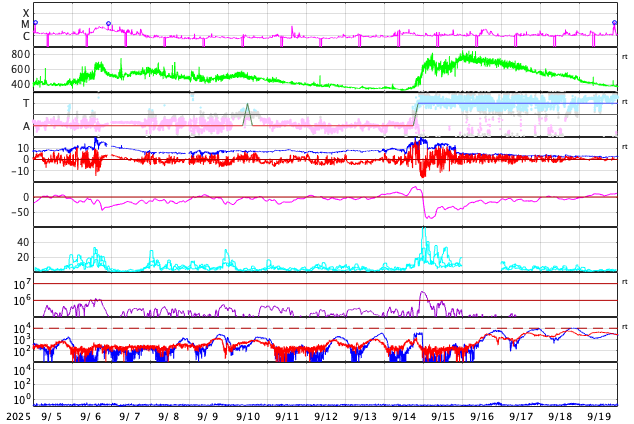 2025/10/ 3 13:56 750km/秒の高速太陽風が続いています。磁気圏活動も活発です。
