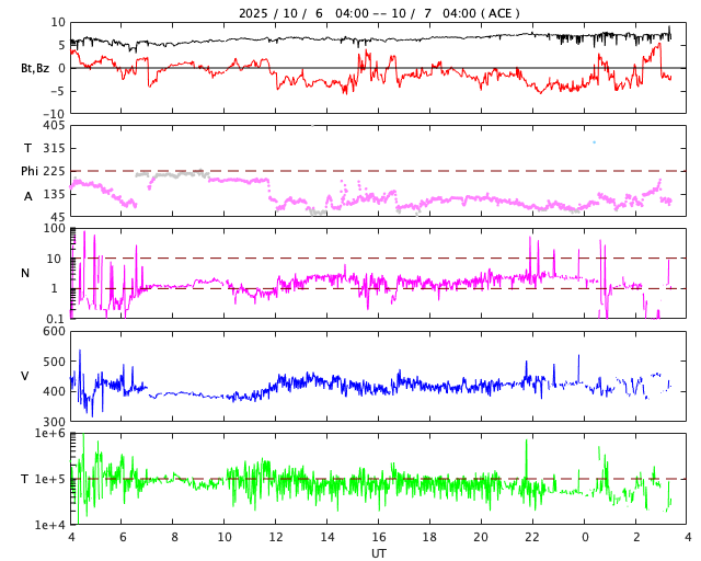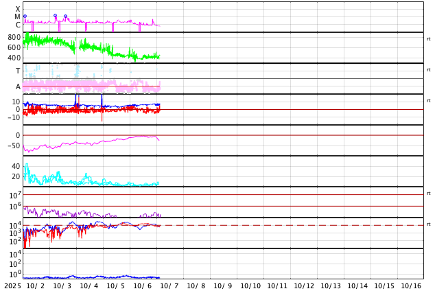 2025/10/ 4 08:57 太陽風は高速ですが、600km/秒に下がっています。磁気圏は活動的な状態です。