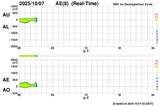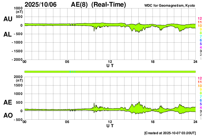 下段のAEグラフの値が高くなると、オーロラ活動が活発化しています。