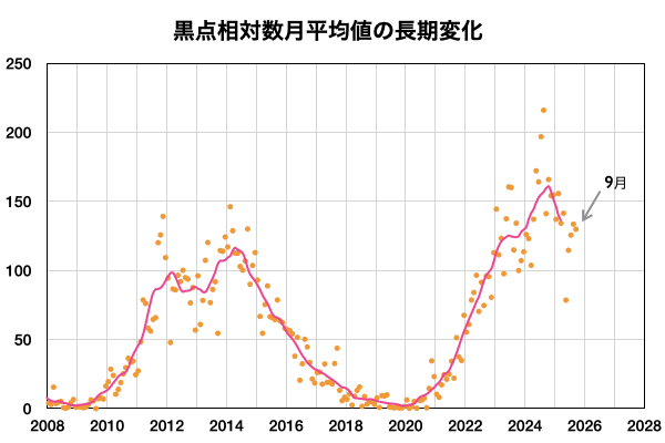 太陽黒点相対数の長期変化。9月の黒点相対数は 129.8 でした。