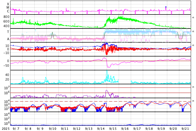 2025/10/ 9 11:53 更新 太陽風は低速になっています。現在の磁気圏は穏やかです。 担当 篠原 太陽風の速度は、400km/秒から340km/秒へ下がり、 低速になっています。 磁場強度は、7nTから10nTへゆっくり強まり、 グラフの最後で少し下がっています。 磁場の南北成分は、グラフの中ほどまでは南向きの状態が続き、 その後北向きにゆっくりと変化しています。 この変化に対応して、 磁気圏の活動は、やや活動的な状態から穏やかな状態に変化しています。 AE指数は、初めは500nT前後の変化が続いていますが、 途中から変化がなくなり、現在はとても穏やかです。 GOES衛星SUVI 195では、 太陽のちょうど真ん中にコロナホールが広がっています。 現在、この領域から地球の方向へ 速度の高い太陽風が吹き出していると思われます。 2日後くらいから太陽風の速度が高まるかもしれません。 注目して下さい。 太陽は穏やかな状態で、X線グラフは目立った変化はありません。 可視光写真は、黒点が少なくなっています。