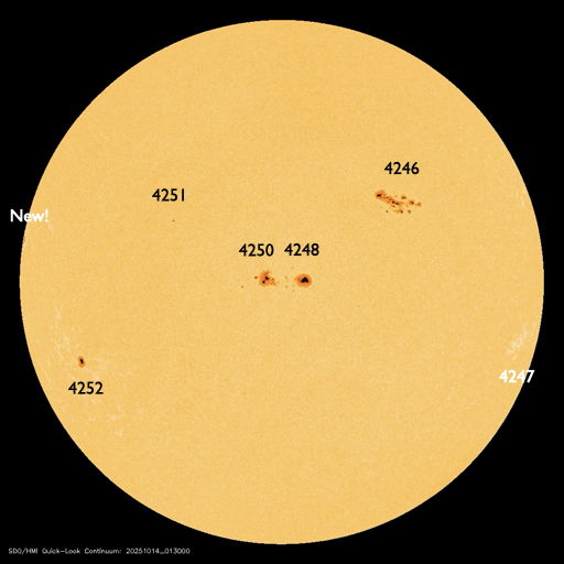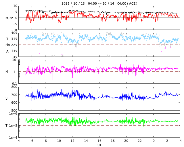 2025/10/10 14:45 太陽風の速度は300km/秒とより低速になっています。
