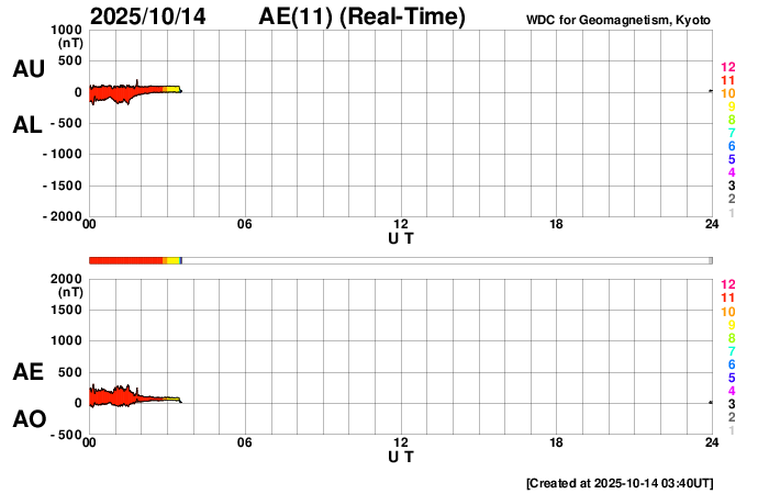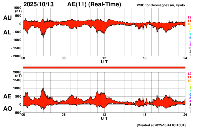 下段のAEグラフの値が高くなると、オーロラ活動が活発化しています。