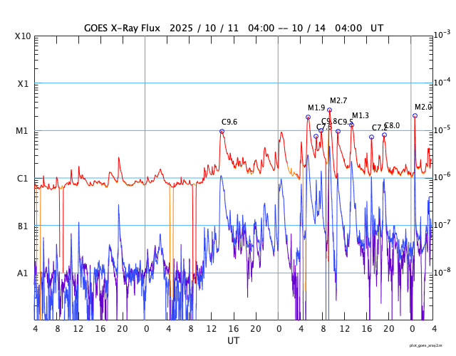 2025/10/13 13:48 太陽風は700km/秒台の高速風が続いています。C9.6、C9.3の小規模フレアが発生しました。