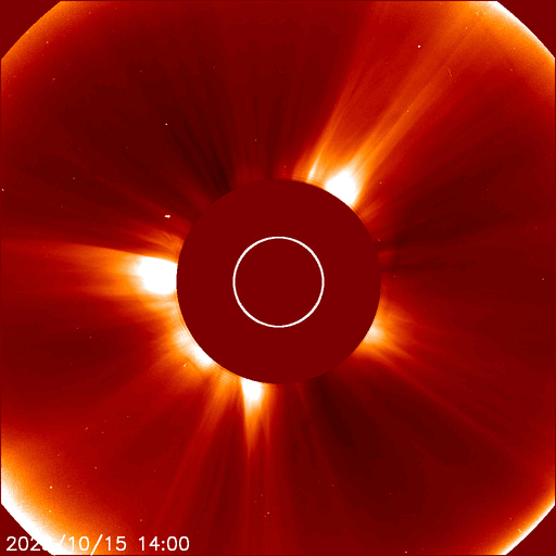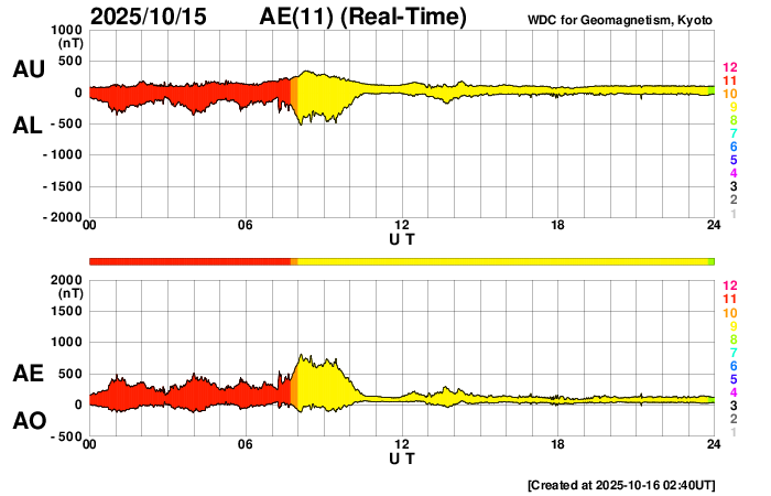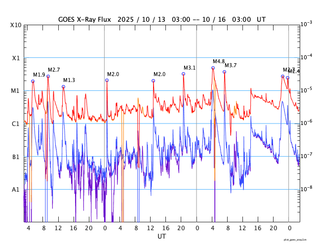 2025/10/16 11:58 更新 4246黒点群で、Mクラスフレアの発生が続いています。高速太陽風は終わりました。 担当 篠原 太陽の北西側(右上)の4246黒点群では、 活発なフレアの発生が続いています。 昨日のニュース以降では、 M3.7、M1.1、M2.7、M2.4、M1.1と 中規模フレアが5回発生しています。 15日23時(世界時14日14時)に発生したM1.1、 16日7時(世界時14日22時)のM2.7と、 その後のM2.4、M1.1のフレアの様子を、 GOES衛星SUVI 131の動画で紹介します。 これらのフレアでは、CME(コロナ質量放出)も発生していて、 SOHO衛星LASCO C2、C3では、 太陽の右上へ広がる様子が観測されています。 横向きに近い噴出なので、地球への影響はないでしょう。 4266群は、この後太陽の端に近付きます。 見えている間にどの様な活動を起こすでしょうか。 太陽風は、昨日の午後から速度はゆっくりと低下して、 550km/秒から460km/秒へ下がっています。 高速の状態は終わり、平均的な速度に戻っています。 磁場強度は、4nTから2nTへ下がり、 その後4nTに戻っています。 磁気圏は穏やかになっていて、 AE指数は、グラフの途中から変化が見られなくなっています。 GOES衛星SUVI 195では、 コロナホールが太陽の中心線に達しています。 3日後くらいから太陽風の速度が高まる可能性があります。 27日周期の図を見ると、 前周期は9月22日から速度が高まっていて、 これは、今回は10月19日に相当します。 ![]() 4246黒点群で発生した、M1.1の中規模フレア。 (c) GOES衛星SUVI 131 (NOAA)、(動画加工 : 宇宙天気ニュース) ![]() 4246黒点群で発生した、M2.7、M2.4、M1.1の中規模フレア。 (c) GOES衛星SUVI 131 (NOAA)、(動画加工 : 宇宙天気ニュース) ![]() 太陽の右上へ広がるCME。2つのフレアの動画に対応して、CMEが2回飛び出しています。 (c) SOHO衛星LASCO C2、C3 (ESA & NASA)、(動画加工 : 宇宙天気ニュース) ![]() GOES衛星SUVI 195カメラによる太陽コロナの様子 (c) GOES衛星SUVI 195 (NOAA) ![]() SDO衛星による太陽の可視光写真。SOHO衛星のWebページより取得しました。 (c) SDO (NASA) ![]() GOES衛星の太陽X線強度。赤・橙 = 0.1〜0.8 nm、青・紫 = 0.05〜0.4 nm (c) データ:NOAA/SWPC、作図:宇宙天気ニュース ![]() ACEが観測した太陽風の磁場(黒線は全体の強度、赤線は南北成分) 磁場の向き、プラズマの密度、速度、温度 (c) データ:NOAA/SWPC、作図:宇宙天気ニュース ![]() AE指数(速報値) 下段のAEグラフの値が高くなると、オーロラ活動が活発化しています。 (c) 京都大学WDC ![]() ![]() 27日の太陽周期に合わせた図 太陽が同じ面を地球に向けていた27日前の変化から、今後を予想することができます。 (c) 作図:宇宙天気ニュース