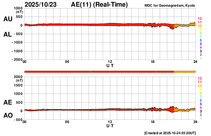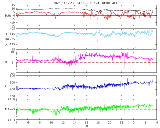 2025/10/23 12:38 太陽風は平均的な速度です。磁気圏は穏やかです。