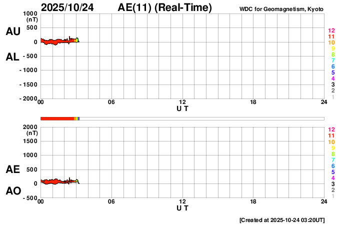 下段のAEグラフの値が高くなると、オーロラ活動が活発化しています。