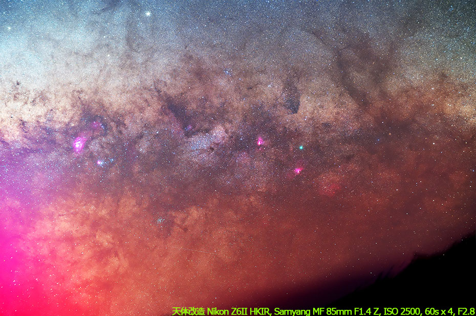すぐ下の赤い光はわし星雲(M16)、左の赤い光はオメガ星雲(M17)、