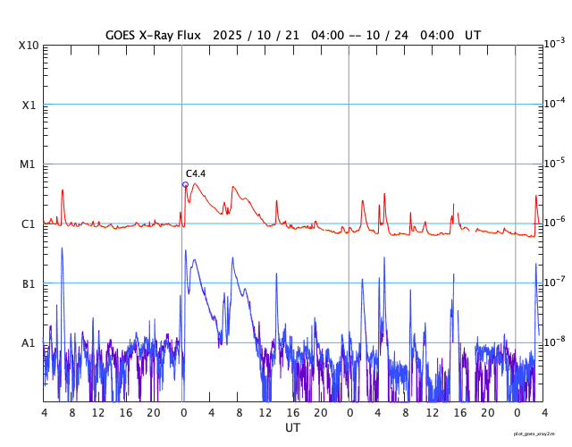 GOES衛星の太陽X線強度。赤・橙 = 0.1〜0.8 nm、青・紫 = 0.05〜0.4 nm