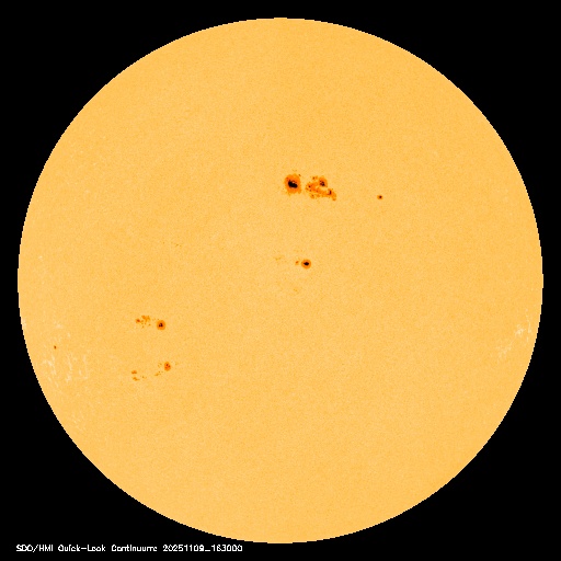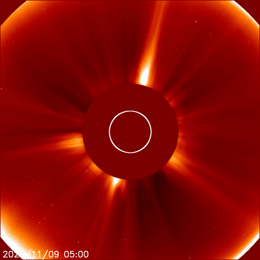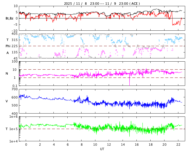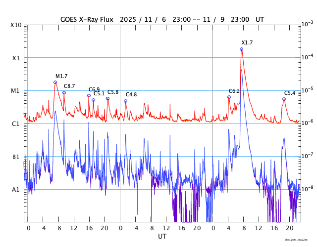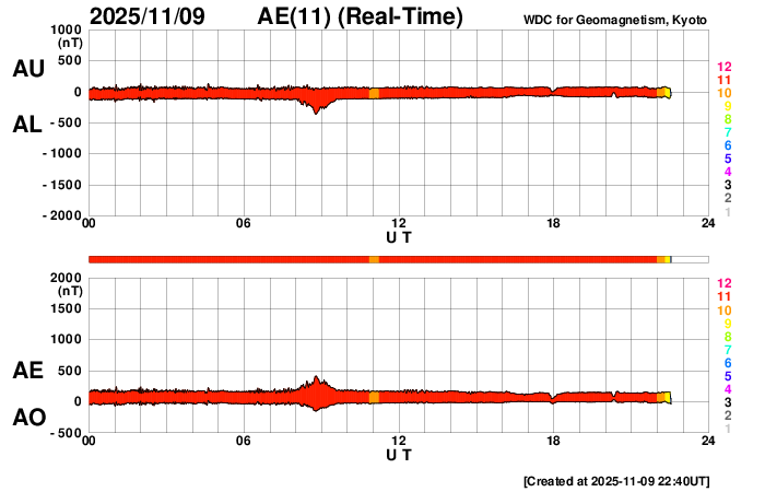2025/11/10 07:48 更新 X1.7の大規模フレアが発生しました。CMEによる太陽風の乱れが地球に向かっています。 担当 篠原 昨夕、9日16時(世界時9日7時)に、太陽の中心部北側の4274黒点群で、 X1.7の大規模フレアが発生しました。 4274群のXフレアは、世界時4日に発生したX1.8以来です。 GOES衛星SUVI 131の動画を掲載します。 このフレアに伴って、CME(コロナ質量放出)が発生しています。 SOHO衛星LASCO C2、C3と GOES衛星CCOR-1の動画を掲載します。 太陽の右上側に少し濃く広がっている様ですが、 太陽を丸く囲むように広がるハロー型のCMEになっています。 また、太陽を地球よりも右斜めから観測している STEREO Ahead衛星COR2では、 CMEは地球のある左側に飛び出しています。 NOAA/SWPCの太陽風予報によると、 このCMEによる太陽風の乱れは、 明後日の未明、12日3時(世界時11日18時)頃に 地球に到来する可能性があるとのことです。 この場合、フレアの発生から地球まで2日半ほどかかることになります。 速度の高まりはそれほど大きくはなさそうです。 しかし、オーロラなど磁気圏活動の強まりは、 太陽風磁場の南向きの変化が大きく影響します。 どの様な乱れがやって来るのか注目して下さい。 太陽は、その後は目立った活動は発生していません。 太陽風は、速度が600km/秒から500km/秒近くまで下がり、 最後は550km/秒に少し上がっています。 高速の状態は続いています。 磁場強度は、4nTから6nTに少し上がっていますが、 平均的な状態です。 太陽風磁場の南北成分は、北寄りの傾向が続いています。 グラフの最後で、-5nTの南向きの変化が発生していますが、 この後はどちら寄りで推移するでしょうか。 磁気圏は穏やかで、AE指数はほとんど変化がありません。 GOES衛星SUVI 195では、 北西(右上)のコロナホールはほとんど見えなくなり、 このコロナホールによる高速太陽風は、そろそろ終わりそうです。 続いて到来するCMEによる乱れに注目して下さい。 ![]() 4274黒点群で発生した、X1.7の大規模フレア。 (c) GOES衛星SUVI 131 (NOAA)、(動画加工 : 宇宙天気ニュース) ![]() 太陽を丸く囲むように広がるハロー型のCMEが発生しています。 (c) SOHO衛星LASCO C2、C3 (ESA & NASA)、(動画加工 : 宇宙天気ニュース) ![]() 太陽の右上側に少し濃く飛び出している様です。 (c) GOES衛星CCOR-1 (NOAA)、(動画加工 : 宇宙天気ニュース) ![]() 太陽を地球よりも右斜めから観測しているSTEREO Ahead衛星では、CMEは地球のある左側に広がっています。 (c) STEREO Ahead衛星COR2 (NASA)、(動画加工 : 宇宙天気ニュース) ![]() 太陽風の乱れは、12日3時(世界時11日18時)頃に地球に到来する可能性があります。 (c) WSA-ENLIL太陽風予報 (NOAA)、(動画加工 : 宇宙天気ニュース) ![]() GOES衛星のSUVI 195カメラによる太陽コロナの様子 (c) NOAA/SWPC ![]() SDO衛星による太陽の可視光写真(SOHO衛星の画像ページより取得)。 マウスの矢印を写真に重ねると、黒点番号付きの写真に切り替わります。 (c) SDO (NASA) ![]() GOES衛星の太陽X線強度。赤・橙 = 0.1〜0.8 nm、青・紫 = 0.05〜0.4 nm (c) データ:NOAA/SWPC、作図:宇宙天気ニュース ![]() ACEが観測した太陽風の磁場(黒線は全体の強度、赤線は南北成分) 磁場の向き、プラズマの密度、速度、温度 (c) データ:NOAA/SWPC、作図:宇宙天気ニュース ![]() AE指数(速報値) 下段のAEグラフの値が高くなると、オーロラ活動が活発化しています。 (c) 京都大学WDC ![]() 27日の太陽周期に合わせた図 太陽が同じ面を地球に向けていた27日前の変化から、今後を予想することができます。 (c) 作図:宇宙天気ニュース