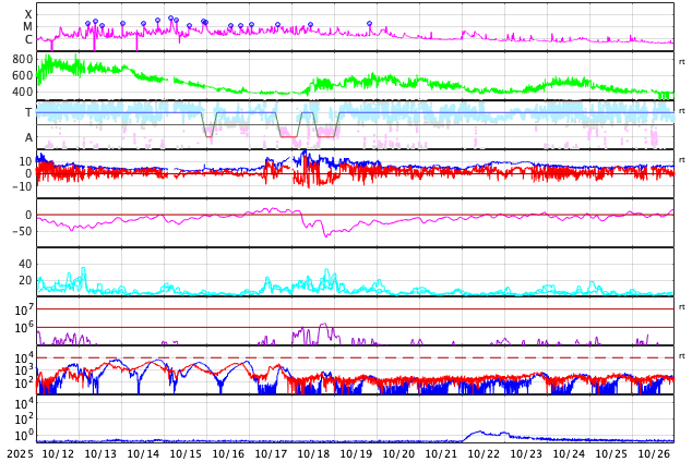 太陽放射線が非常に強くなっています。放射線帯電子は静穏です。