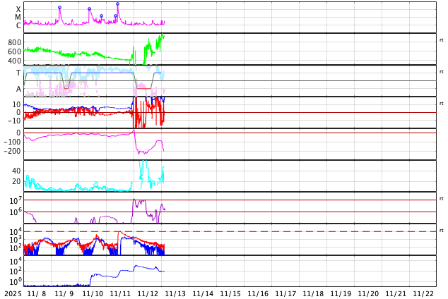 CME(コロナ質量放出)による太陽風の乱れが到来した様です。