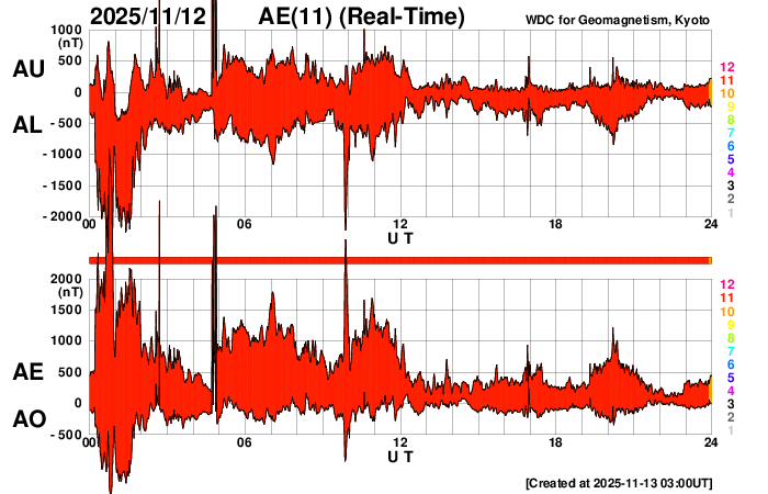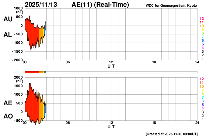下段のAEグラフの値が高くなると、オーロラ活動が活発化しています。