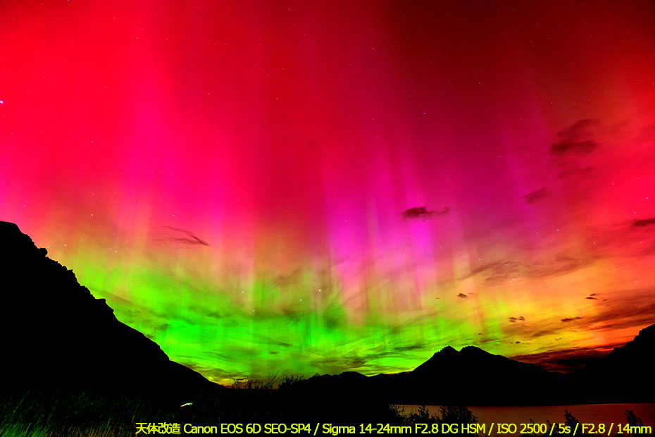 空を覆うように見える赤色のオーロラがとても印象的です。