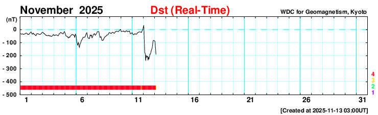 Dst指数も再び-200nTに近付く変化が発生しています。