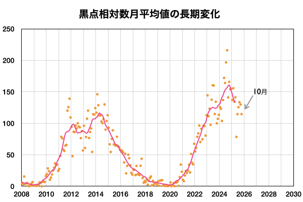 2025/11/18 13:39 更新 太陽風は高速の状態が続いています。10月の黒点相対数は 114.6 でした。 担当 篠原 Xフレアや磁気嵐などで報告がかなり遅れましたが、 WDC-SILSO より、10月の黒点相対数月平均値は、 114.6 と発表されています。 黒点相対数は、5月に78.5と大きく下がったものの、 その後、8月には133.5まで戻りましたが、 9月は129.8、10月は114.6と、以降は低下が続いています。 この変化だと、2026年の途中で100を割るくらいでしょうか。 太陽風は、速度が530km/秒から500km/秒へ少し下がっている様です。 高速の状態は続いています。 磁場強度は、5nTから6nTへ少し変化しています。 磁場の南北成分は、北寄りになっています。 磁気圏は穏やかで、AE指数は小さい変化が見られる程度です。 GOES衛星SUVI 195では、 コロナホールは北西の端(右上)に達しています。 太陽風の速度は、この後は下がって行きそうです。 太陽は、北西の端の向こう側に進んだ4274黒点群で活動が発生して、 C6.1の小規模フレアと、 太陽の右上へ広がるCME(コロナ質量放出)が発生しています。 太陽のこちら側は、 中心部南西側(右下)の4284群でC5.4の小規模フレアが発生しています。 その他は穏やかです。