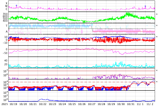 2025/11/18 13:39 太陽風は高速の状態が続いています。10月の黒点相対数は 114.6 でした。