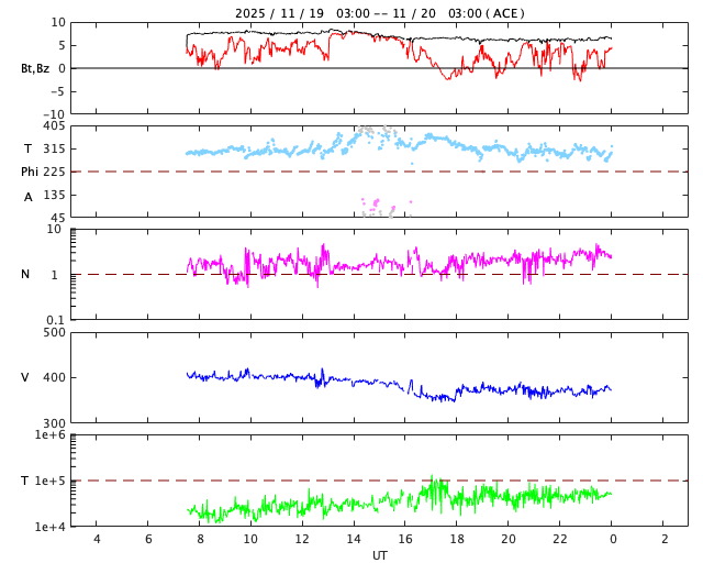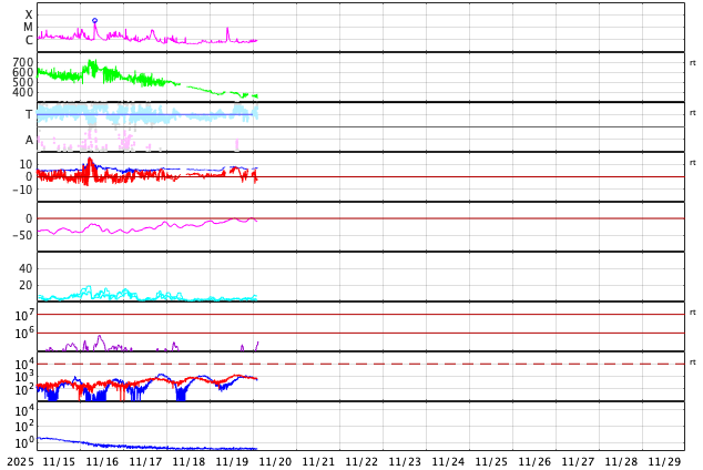 2025/11/19 13:24 太陽風は平均的な速度に戻っています。磁気圏も穏やかです。