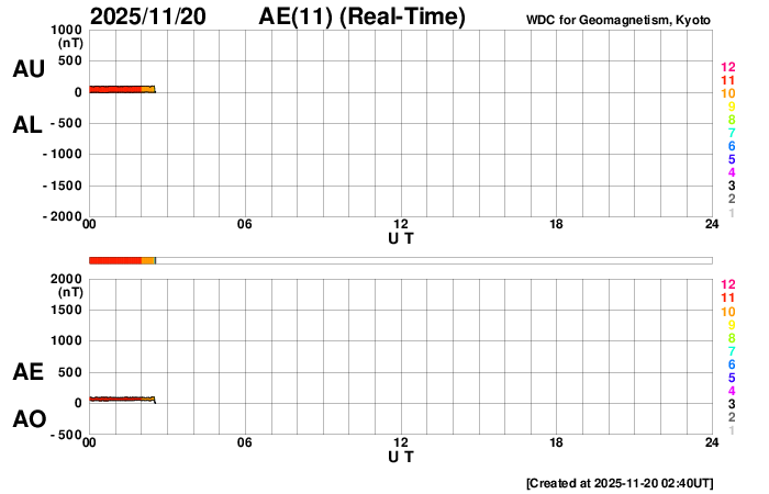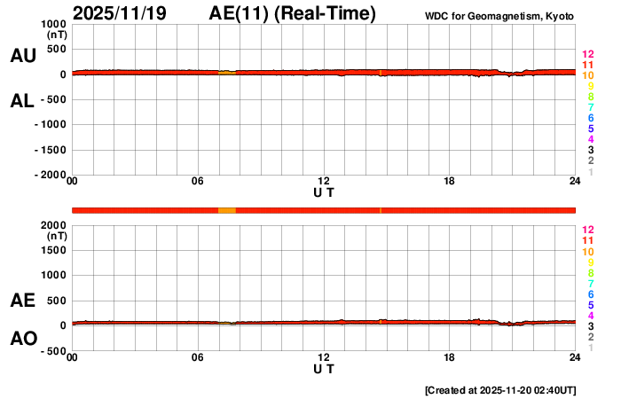 下段のAEグラフの値が高くなると、オーロラ活動が活発化しています。