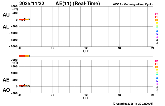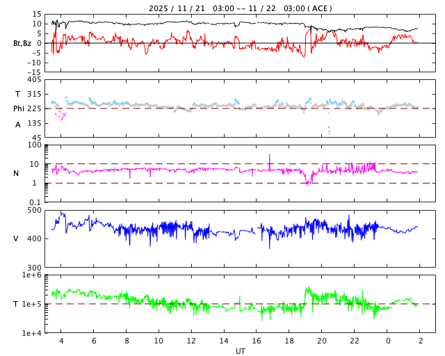 2025/11/22 11:10 更新 太陽風は平均的な状態です。太陽の向こう側でCMEが発生しました。 担当 篠原 太陽風の速度は、450km/秒から430km/秒へ少し下がっています。 平均的な状態です。 磁場強度は、今日未明にかけて10nTに強まった状態が続きましたが、 その後下がって、現在は6nTと平均的な状態です。 磁場の南北成分は、グラフの後半で弱い南寄りになっています。 磁気圏では小規模の活動が発生している様で、 AE指数は、300nTくらいの変化が半日ほど続いています。 GOES衛星SUVI 195では、 中心部東側(左側)の赤道付近にコロナホールが見えています。 広がりはあまり大きくありませんが、 4日後くらいからこの領域の影響で 太陽風の速度が高まるかもしれません。 また、南東の端(左下)にもコロナホールが見えています。 こちらの広がりはどうでしょうか。 太陽は、南東の端の4290黒点群で、 C3.8、C2.1、C2.3と小規模フレアが発生しています。 その他は穏やかな状態です。 一方、太陽の向こう側ではある程度の規模の活動が発生している様で、 GOES衛星CCOR-1では、 22日4時(世界時21日19時)頃に、 太陽の左上寄りに大きく広がるCME(コロナ質量放出)が観測されています。 太陽を地球よりも右斜めから観測しているSTEREO Ahead衛星COR2では、 CMEは太陽の右側に飛び出していて、太陽の向こう側の現象です。