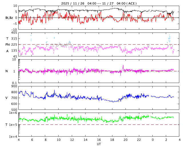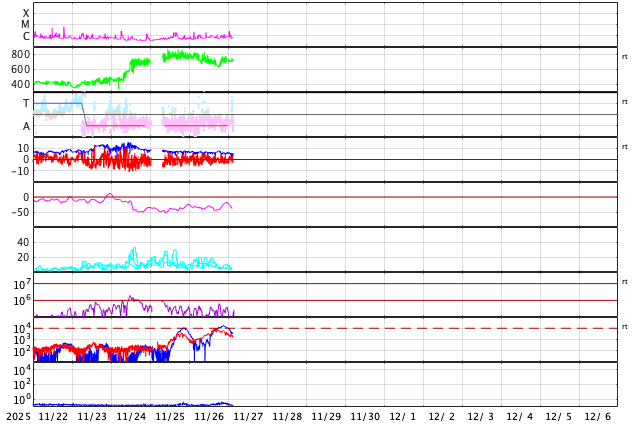 2025/11/27 12:22 更新 太陽風は700km/秒と高速の状態が続いています。磁気圏も活動的です。 担当 篠原 太陽風の速度は、800km/秒近い状態から少し下がり、 700km/秒付近で推移しています。 かなり高まった状態は続いています。 磁場強度は、5〜6nTと平均的な状態です。 磁場の南北成分は、南北にゆっくりと変化しています。 速度が高まっていることもあり、 磁気圏は活動的な状態が続いていて、 AE指数は、500〜1000nTの中規模の変化が続いています。 GOES衛星SUVI 195では、 コロナホールは、西の端(右端)に次第に近付いています。 コロナホールの影響は、この後は下がっていきそうです。 太陽は、穏やかな状態が続いています。 フレアは、中心部南東側(左下)の4291黒点群で、 C2.7の小規模フレアが発生した程度です。