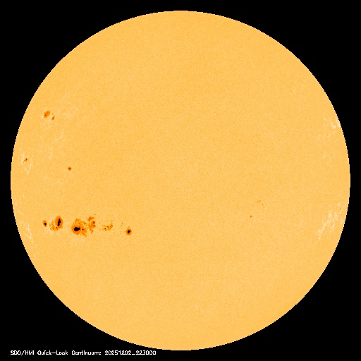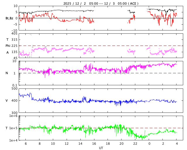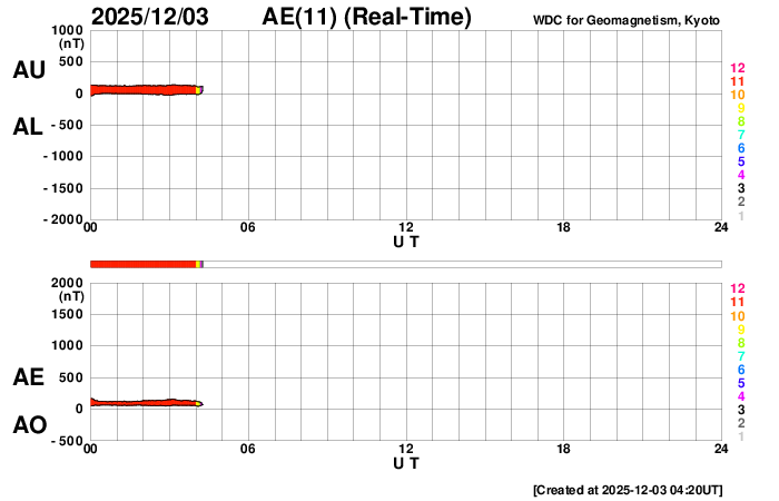 2025/12/ 3 13:20 更新 太陽風は平均的な状態です。コロナホールの影響が始まりそうです。 担当 篠原 太陽風の速度は、400km/秒前後と平均的な状態で推移しています。 磁場強度は、6nTと平均的な値です。 磁場の南北成分は、弱い南寄りの変化が発生しています。 磁気圏では小規模の変化が見られていて、 AE指数は、300nTの小規模の変化が続き、 700nTに達する中規模の変化も発生しています。 GOES衛星SUVI 195の太陽コロナ写真では、 北半球のコロナホールは、西側にだいぶ進んでいます。 これから、この領域の影響で、 太陽風の速度が高まりそうです。 太陽は、中心部南東側(左下)の4298黒点群でC4.0、 北西の端(右上)の4288群でC5.4、 北東(左上)の4299群でC4.1 などの小規模フレアが発生しています。 今の所、特に活発に活動している領域はありません。