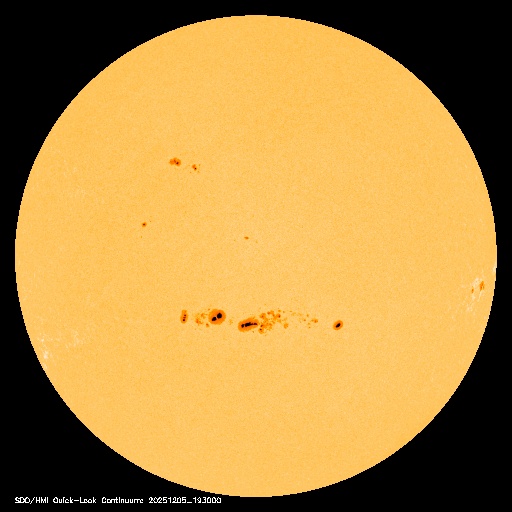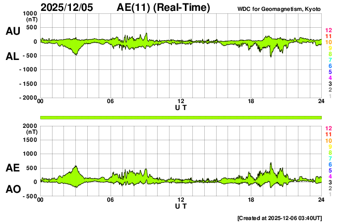 2025/12/ 6 12:52 更新 太陽風の速度は700km/秒に高まっています。磁気圏もある程度活動的です。 担当 篠原 太陽風の速度は、今日未明にかけて600km/秒となっていましたが、 そこから再び高まって、現在は700km/秒とかなり高速です。 磁場強度は、5〜7nTと平均的な状態です。 磁場の南北成分は、 南寄りになったり、北寄りになったりしています。 南寄りになった頃に磁気圏の活動が強まって、 AE指数は、500nT前後の中規模の変化が発生しています。 GOES衛星SUVI 195を見ると、 コロナホールは、西の端(右端)に進んで、 広がりが見にくくなっています。 太陽風速度の高まりはどこまで続くでしょうか。 太陽は、中心部南側の4294、4296黒点群で、 C4.3、C3.8、C5.2、C6.4など、 小規模フレアが頻繁に発生しています。 活動の規模が大きくなる様であれば、注目して下さい。 ![]() GOES衛星のSUVI 195カメラによる太陽コロナの様子 (c) NOAA/SWPC ![]() SDO衛星による太陽の可視光写真(SOHO衛星の画像ページより取得)。 マウスの矢印を写真に重ねると、黒点番号付きの写真に切り替わります。 (c) SDO (NASA) ![]() ACEが観測した太陽風の磁場(黒線は全体の強度、赤線は南北成分) 磁場の向き、プラズマの密度、速度、温度 (c) データ:NOAA/SWPC、作図:宇宙天気ニュース ![]() AE指数(速報値) 下段のAEグラフの値が高くなると、オーロラ活動が活発化しています。 (c) 京都大学WDC ![]() ![]() 27日の太陽周期に合わせた図 太陽が同じ面を地球に向けていた27日前の変化から、今後を予想することができます。 (c) 作図:宇宙天気ニュース