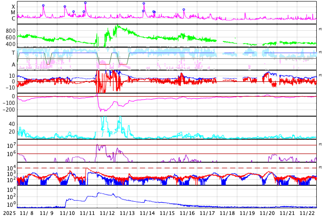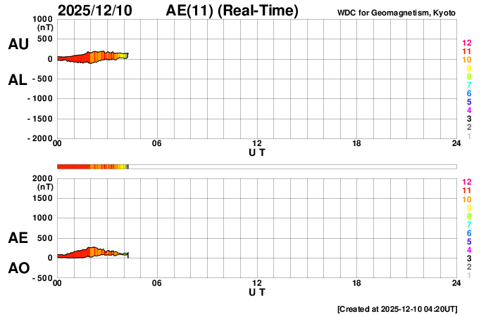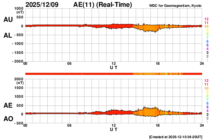 下段のAEグラフの値が高くなると、オーロラ活動が活発化しています。
