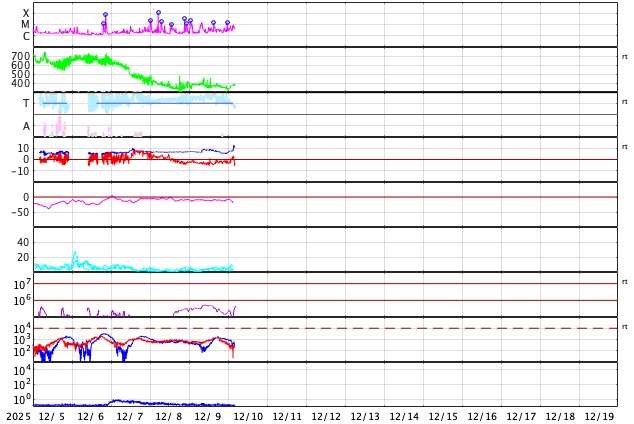 2025/12/ 6 12:52 太陽風の速度は700km/秒に高まっています。磁気圏もある程度活動的です。