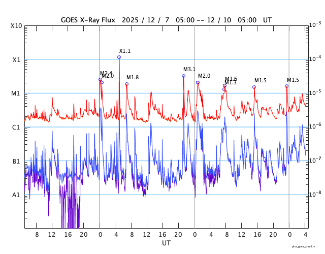 2025/12/ 9 10:55 X1.1の大規模フレアが発生しました。太陽風は低速です。CMEによる乱れが到来する可能性があります。