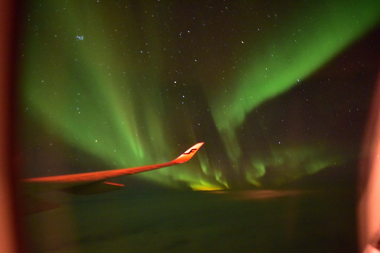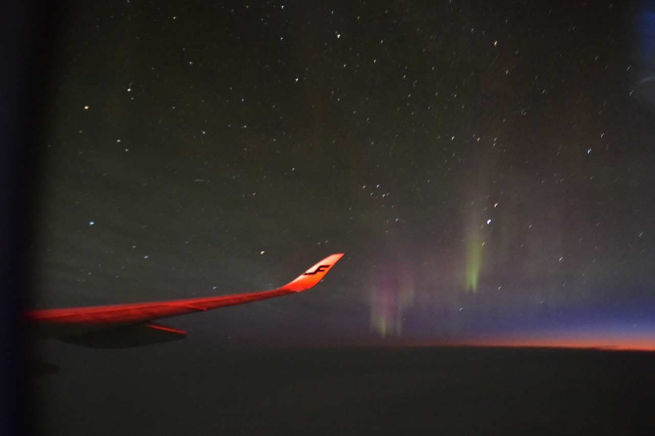 2025/12/17 13:51 更新 太陽風の速度は650km/秒まで高まり、高速の状態が続いています。北極航路の機内からのオーロラをどうぞ。 担当 篠原 アイスランドへオーロラ観測に向かう途中の 飛行機の中から撮影されたオーロラの写真を、 藤井哲也さんからいただきました。 アラスカから北極を越えてスカンジナビア半島に向かう航路で、 藤井さんより「オーロラファンにとってはうれしいコースです」とのことです。 1枚目は、アラスカを越えて北極点に達する少し前と、 かなり高緯度での撮影です。 現地は昼に近い時間帯で(極夜で暗い状態です)、 オーロラが現れやすい緯度は夜の時間帯よりも高くなっています。 ここで撮影できたのはこのことも関係しているのかもしれません。 2枚目はスカンジナビア半島に近づいての撮影とのことで、 現地はほぼ真夜中でした。 オーロラ観望には最適の場所と時間帯だったと言えそうです。 ただし、AE指数を見るとこの日のオーロラの活動はとても弱く、 オーロラの輝きとしては控えめだった様です。 藤井さんは、これからアイスランドで観測されるとのことです。 その最初の撮影情報をどうもありがとうございます。 昨日、500km/秒に高まっていた太陽風の速度は、 その後も上昇が続いて、昨夜遅くに650km/秒に達し、 その状態がしばらく続いて、 現在は少し下がっていますが、570km/秒と高速の状態が続いています。 SDO衛星AIA193の太陽コロナ写真を見ると、 (SDO衛星の画像を掲載するのは3か月ぶりです) 南北に細長く伸びるコロナホールは、西側(右側)にだいぶ進んでいます。 この領域の影響がやってきているのでしょうか。 太陽風の磁場強度は、12nTから7nT程度へ下がっています。 南北成分は、グラフの前半は北寄りでしたが、 後半は0nT付近で小さく変化する様になっています。 磁気圏の活動もこれに対応して、 AE指数は、グラフの前半は変化がありませんが、 途中から小規模の変化が続く様になっています。 速度が高まっていることもあり、 この後もある程度の活動が見られそうです。 SDO衛星AIA193では。東端(左端)に次のコロナホールが現れています。 5〜6日後くらいから、この領域の影響が始まりそうです。 太陽は、穏やかな状態です。 北東の端(左上)の少し向こう側で、 C1.5、C1.9、C1.1と小さいフレアが発生しています。 活発というほどではありませんが、 この後、黒点群が現れそうです。 9月15日からWebサーバーの故障のため停止していた SDO衛星のデータページがある程度回復した様で、 3か月ぶりに太陽コロナや可視光の写真を掲載しています。 停止している間は、 宇宙天気ニュースの中で手作業で対応していた部分があったので、 復活はとても助かります。 完全に復活することを期待しています。