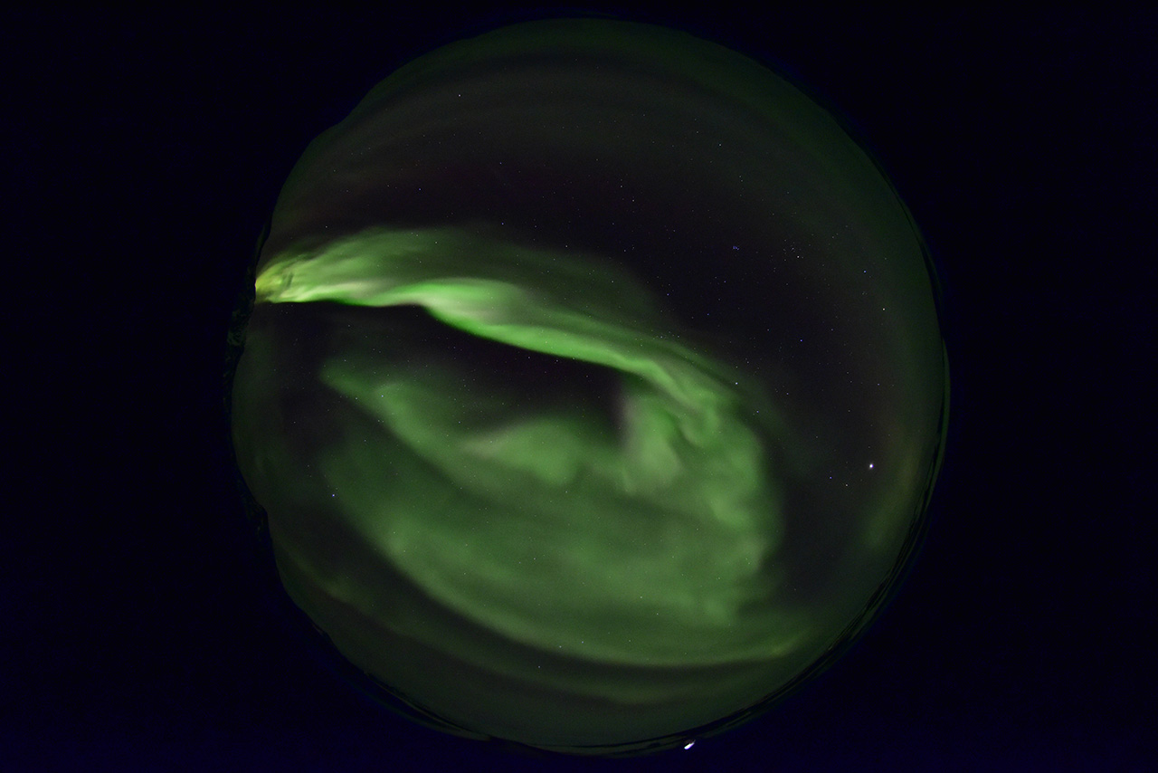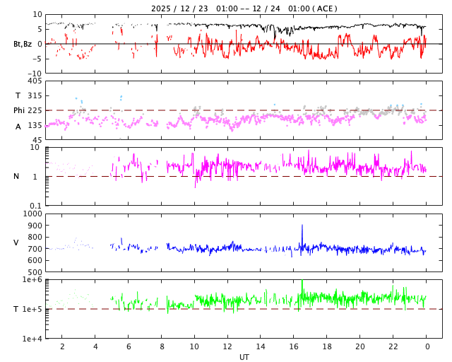 2025/12/24 09:53 更新 高速の太陽風が続き、磁気圏も活動的です。アイスランドのオーロラをどうぞ。 担当 篠原 アイスランドに滞在中の藤井哲也さんと高家幹夫さんより、 現地22日に撮影されたオーロラの写真をいただきました。 太陽風の速度は700km/秒とかなり高く、 AE指数は、22時頃まで700nT程度の中規模の変化が続いていました。 現地は、20時から21時半くらいまで晴れ間があったそうで、 ちょうど良いタイミングで観測できた様です。 光害のほとんどない場所で、月明かりもなく理想的な観測条件だったそうです。 1枚目は晴れてオーロラが見え始めた頃で、2枚目で少し強くなり、 3枚目で一気に激しい輝きが空を覆っています。 4枚目はその1分後とのことで、 短い時間にオーロラの姿が大きく変わる様子が想像できます。 5枚目は、北の空を撮影したもので、 右側に北斗七星、その左に北極星、 上側の真ん中付近にカシオペヤ座が見えています。 山に積もった雪がオーロラに照らされて、 緑色に見えているのがとてもきれいです。 この後、空は雲に覆われてしまったそうです。 最初の頃の写真と比較すると、 太陽風が強まってオーロラの活動が活発になっている様子がとてもよく分かります。 一週間にわたる観測の報告をどうもありがとうございます。 現在の太陽風は、速度が700km/秒から680km/秒へ少し下がっています。 速度がかなり高まっている状態は続いています。 磁場強度は6nT前後で、平均的な状態です。 磁場の南北成分は、弱い南寄りになっています。 磁気圏の活動は活発で、 AE指数は、500〜800nTの中規模の変化が次々に発生しています。 藤井さんの報告の様に、 極域では賑やかなオーロラが続いているのではないでしょうか。 SDO衛星AIA193の太陽コロナ写真を見ると、 高速の太陽風をもたらしているコロナホールは、 西側(右側)の赤道付近から、左下へ向かって南半球の高緯度側に広がり、 その左側では中緯度側へ上がっています。 この左側の広がりは、前周期は見られなかった領域で、 この部分からも影響がやって来ると考えると、 太陽風の強まりは、この後も1週間程度続くかもしれません。 太陽は、X線グラフに目立った変化はなく、 穏やかな状態です。 可視光写真では、黒点が増えて少し賑やかになっています。